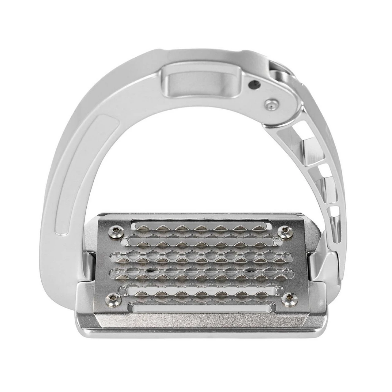 Acavallo Junior Arena Aluplus Stirrups feature a lock and release mechanism that is positioned one centimeter above the tread. This prevents the foot from slipping sideways by mistake and ensures quick opening of the patented laterally opening arm. This outer articulated stirrup arm provides a big release opening (up to 110mm) by pivoting to the outside in case of an emergency. The extra wide and grippy footbed offers maximum comfort for any ride. Acavallo Junior Arena Aluplus Stirrups in Aluminum are an ideal choice for safety and comfort with elegant, contemporary style.