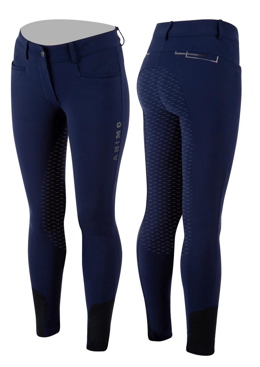 The Animo Nobu Knee Grip Breeches in Blue Navy are wonderfully stretchy, lightweight riding breeches in a classic Euro seat style. NOTE: the photo shows the full seat version. These breeches have silicone print knee patches in a wavy pattern. Women’s Animo Nobu equestrian breeches have a flattering mid-rise with contoured waistband.