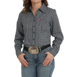 Women’s Kirby Finleigh Geo Print Shirt is a crisp, cool cotton poplin with spandex added to prevent wrinkles and keep you moving around in comfort. Ariat ladies value front long sleeve Western shirt has a single pocket at the chest with Ariat logo embroidery. The cuffs and collar are lined in solid Rose Wine fabric. The lovely Kirby Stretch Finleigh Geo Print Shirt is stylish and versatile for a hard-working Western wardrobe.