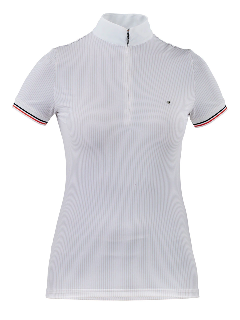 The Arcaster Show Shirt from Aubrion has a slim contoured shape with plenty of stretch for the rider’s movement. The fabric is light and cool, perfect for long, hot show seasons. The short sleeves are trimmed with Aubrion signature stripe knit cuffs. The back of the shirt is printed with a subtle lattice design that catches the light for a bit of sheen. Aubrion Arcaster Short Sleeve Show Shirt in White or Pink Pinstripe is finished with a signature ribbon tab and small Aubrion badge.