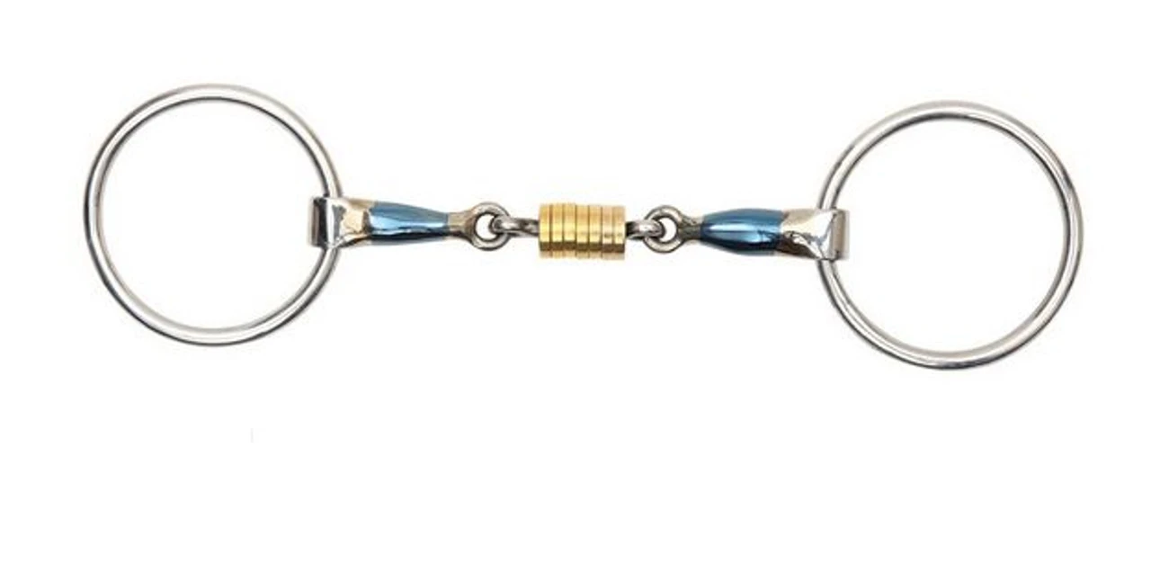 Blue Sweet Iron Roller Link Loose Ring bit from Shires Equestrian is an interesting mix of metals for making a fussy horse more relaxed. The stainless steel cheeks are durable and easy to clean while the blue alloy mouth will oxidize to create a pleasant taste, encouraging salivation. The brass alloy roller discs keep a fussy horse busy and prevent leaning on the bit. Find out if this is the perfect bit for your horse by trying it before committing to a final purchase. The Blue Sweet Iron Roller Link Loose Ring bit is eligible for Mary’s Bit Rental Program. Click now for details!