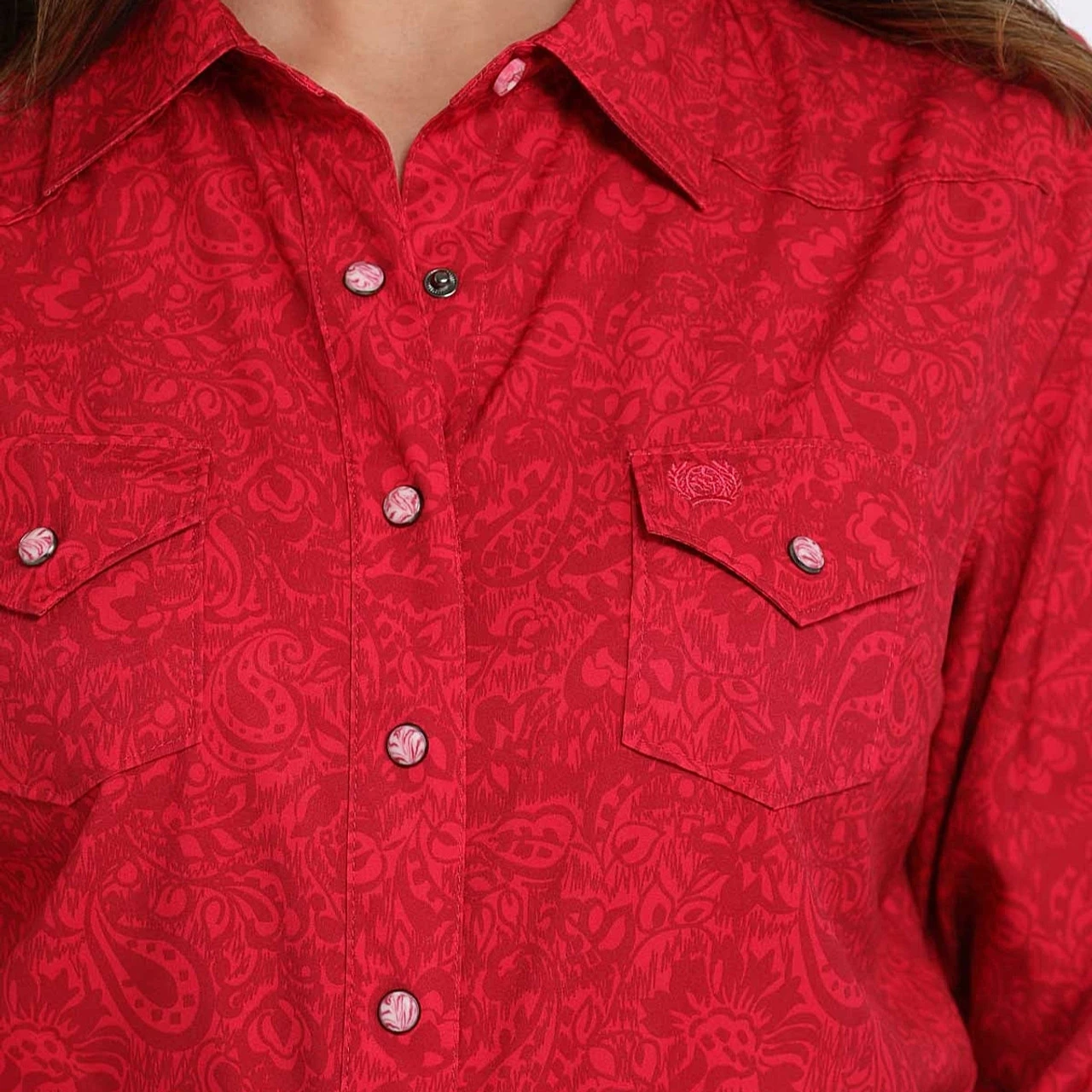 Cinch ArenaFlex Pink Paisley Print Long Sleeve Shirt has single point yokes, flap pockets, and distinctive pink and white swirled snaps. The smooth, stretchy fabric and bust darts enhance the feminine fit. Ladies long sleeve Cinch ArenaFlex Shirt with tonal floral and paisley print delivers a fresh look, UV defense, and total comfort for competition or everyday ranch style.