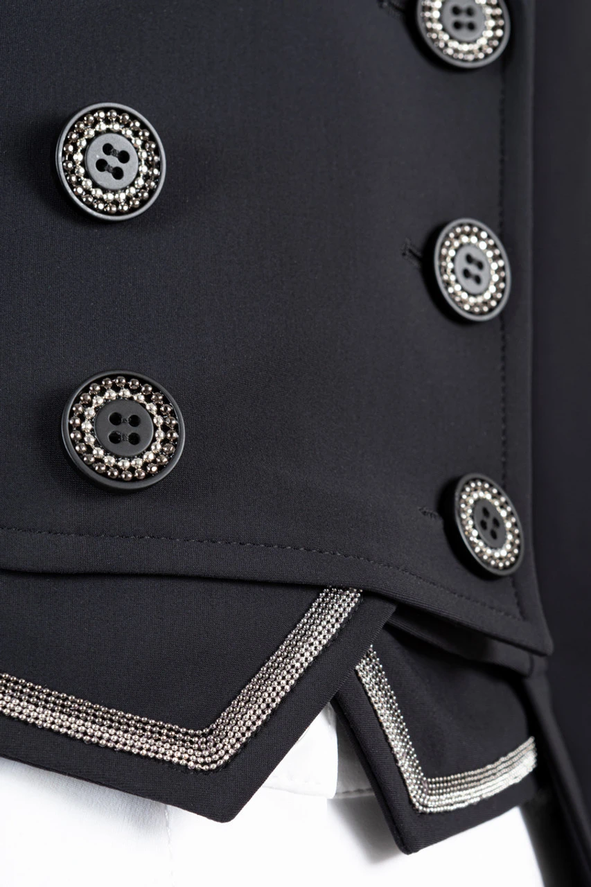 Equiline Grac Tailcoat is truly perfect for the dressage competitor who wants a traditional show coat with elegant accents to set it apart. The ultra fine chain embroidery in silver and jet adds sophisticated shine to the collar, points, and back belt detail. The adjustable weighted hem of the Grac Tailcoat ensures a correct drape and profile.