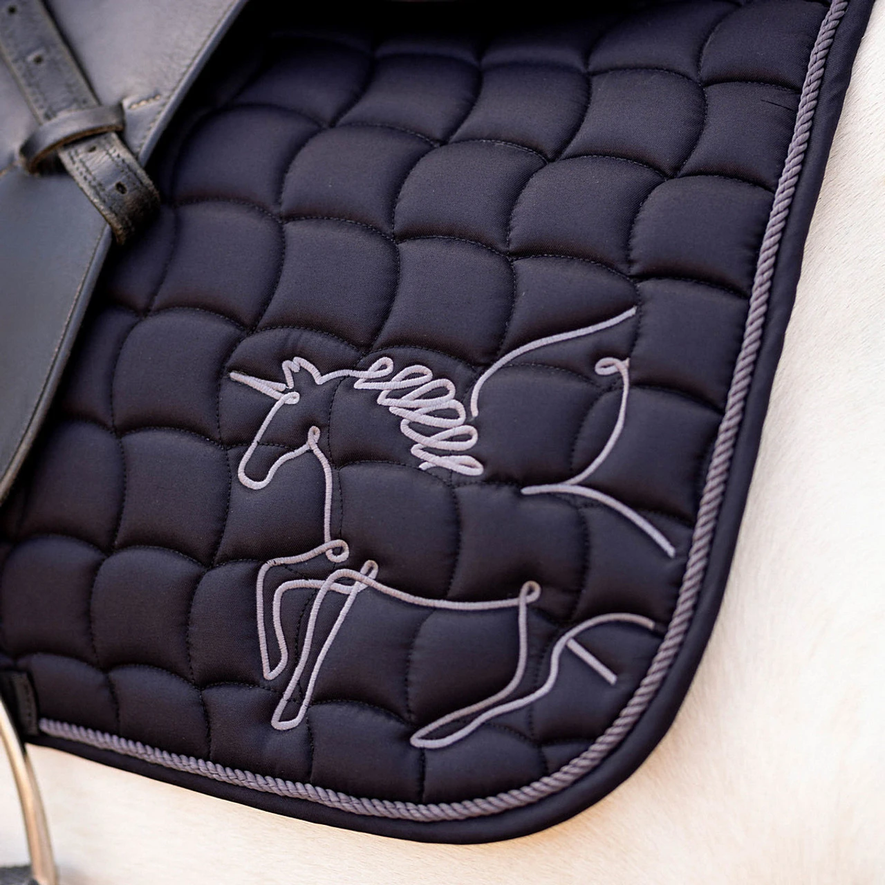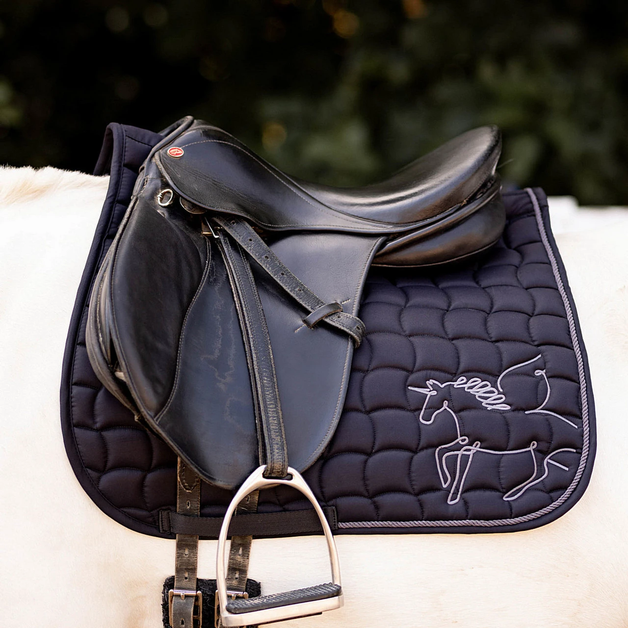 Horze Pegasus Pony Saddle Pad delivers fun style that’s perfect for lessons and casual rides. Horze Pegasus Pad in Pony size is a lightly padded quilted square pad to fit a pony close contact jump or all purpose English saddle.