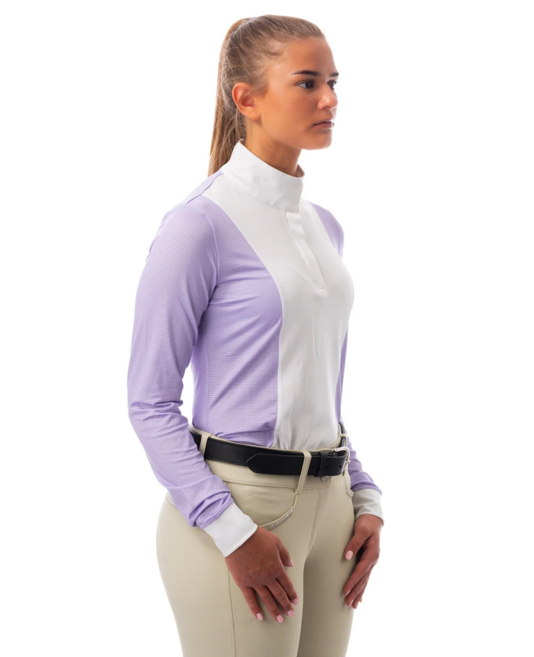 Equinavia Martha Long Sleeve Show Shirt has a classic show ring look with technical fabric comfort plus a beautiful lavender color. The front panel, show collar with stock tie loop, and cuffs are white so you’ll present a traditional appearance while wearing a jacket. Lightweight fabrics ensure the Martha Show Shirt is breathable, cooling, and stretchy for full range of motion.