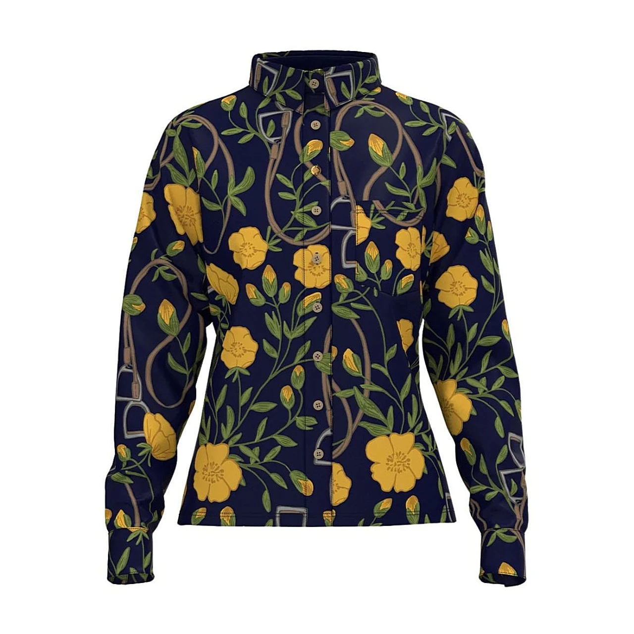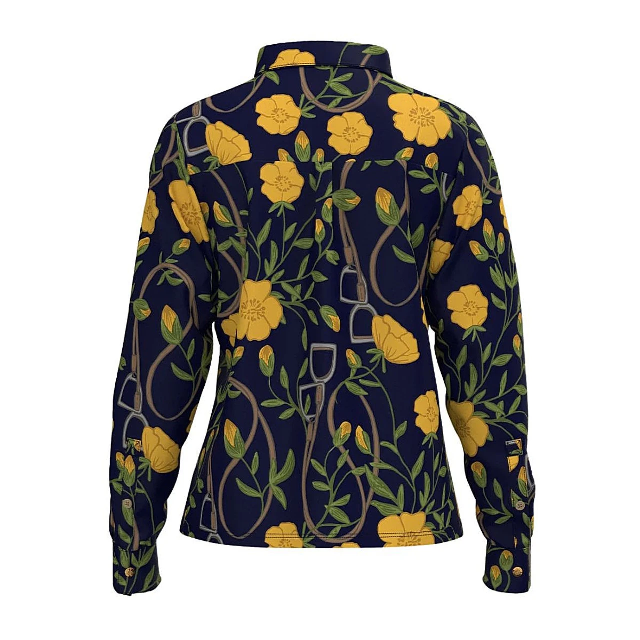 Women’s Espoir Floral Stirrups Shirt features a rich, beautifully detailed equestrian floral print on navy blue. The long sleeve sun shirt is lightweight and soft with UV protection for riders. Floral Stirrups Shirt has a cuff with branded gold value and feminine, fuller sleeves. The value front also features one gold value. The Espoir shirt has the look of a blouse yet is comfortable and practical for riding with jeans or breeches.