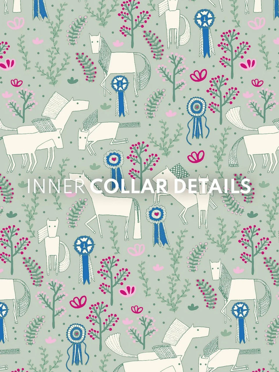 Espoir Equestrian Show Shirt has a hidden quarter length zipper placket and 2 hidden snaps for the show collar. Espoir added a dash of sparkle with the lovely Swarovski logo trim at the chest. The cuffs have custom Espoir branded gold values. The collar is lined with Rosettes or Stripes equine art print fabric and the back of the collar is trimmed with a small signature Espoir ribbon. Women’s Long Sleeve Espoir Show Shirt has tasteful shine and performance features that make it a welcome addition to your riding competition wardrobe.