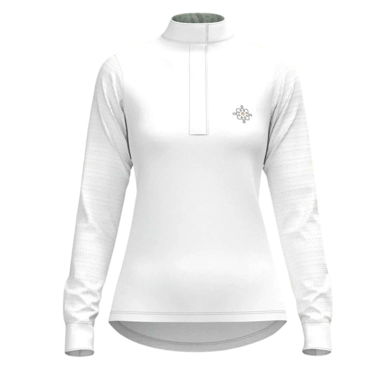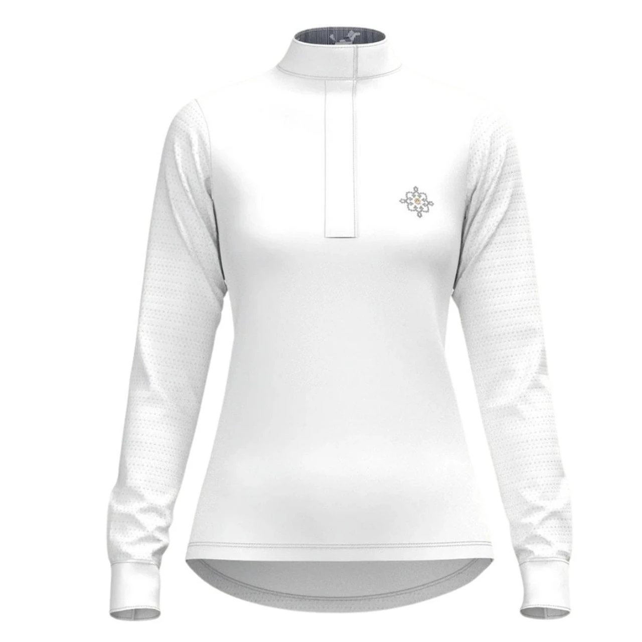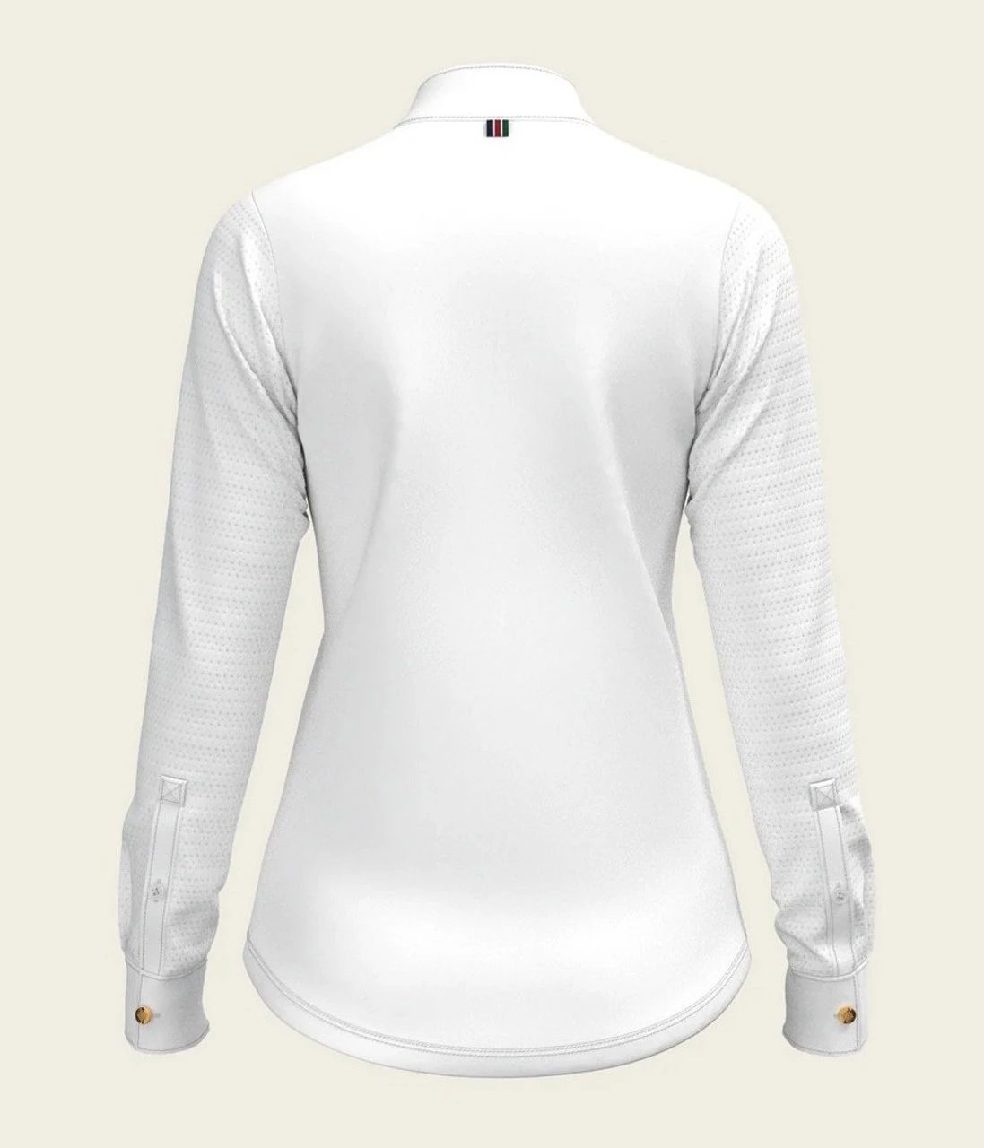 Espoir Long Sleeve Show Shirt for women is a long sleeve show shirt with a traditional look and elegant details. The Espoir Show Shirt starts with quick drying, breathable stretch fabric that has a smooth, luxurious feel. The sleeves are an opaque textured mesh that is also soft, stretchy, and so comfortable for competition.