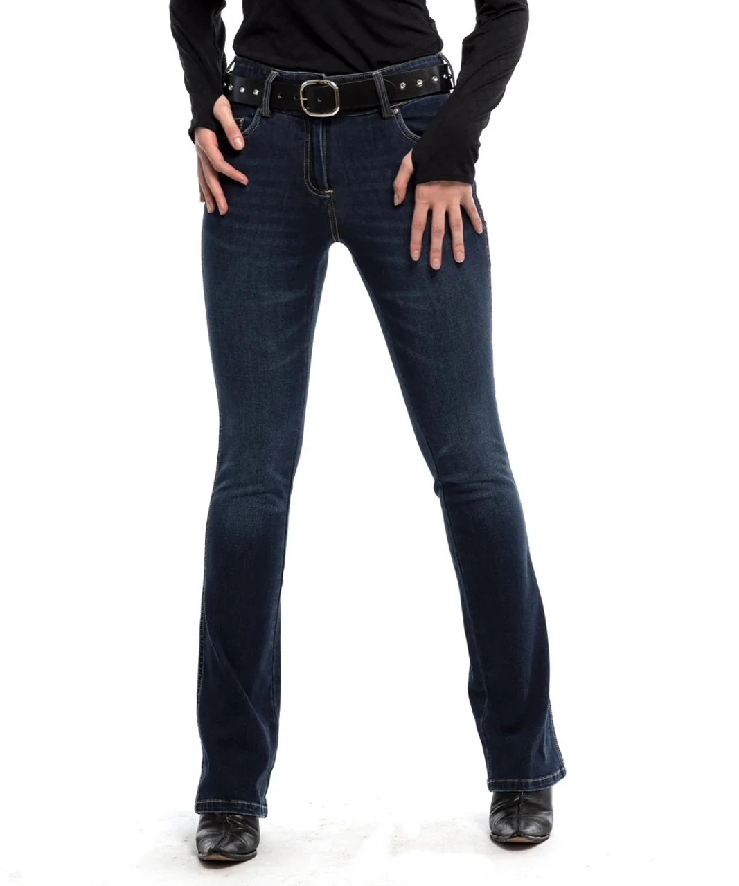 Equestrian Bootcut Jeans have a Western look plus distinctive Goode Rider touches. The back of the jeans have pockets embossed with English spurs and a leatherette Goode Rider tag at the waist. The inside of the waistband has an elasticated band to help keep your shirt tucked in and is very soft if you’re wearing a loose shirt. Chic, versatile, and super comfortable, the Goode Rider Equestrian Bootcut Jeans are available in 3 lengths for the perfect fit.