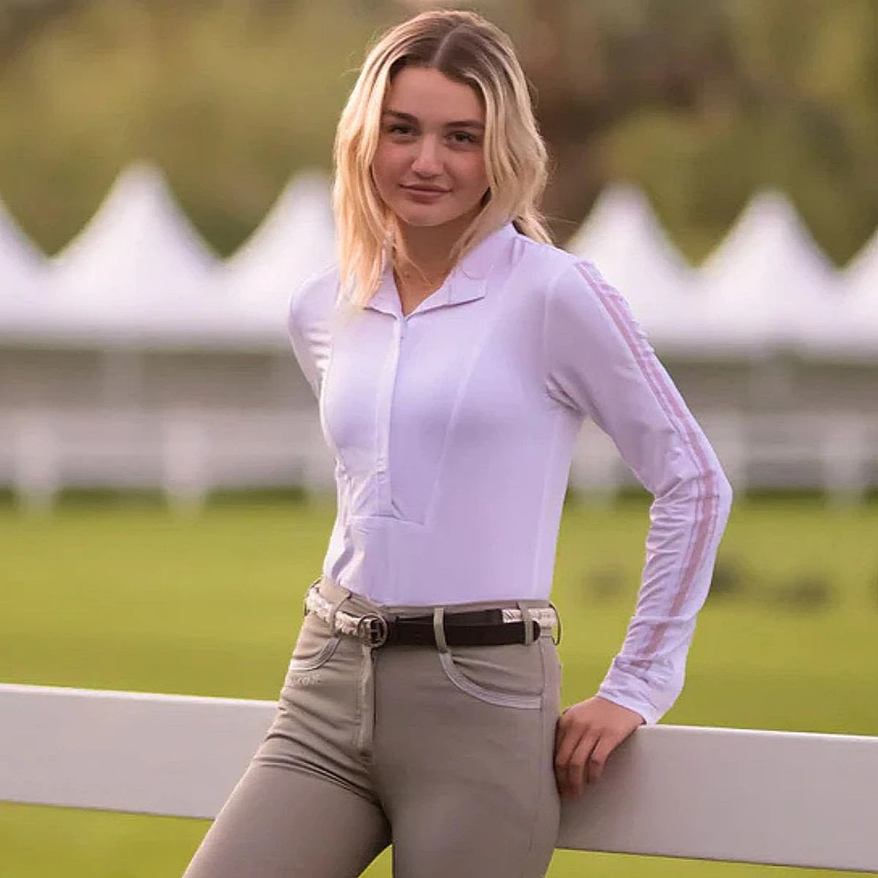 Harcour Cassi Long Sleeve Competition Shirt in White has classic style for hunter, equitation, jumper, and dressage competitors. Women’s Cassi Competition Shirt has a clean white bib front and a hidden magnet closure inside the standing collar. Harcour added white lace along the outer sleeve to create a chic, feminine look to elevate your style.