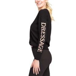Women’s Kastel Denmark Dressage Crew Neck Sweater in Black has signature equestrian charm with its blush pink “Dressage” intarsia knit design on the sleeve. The breathable, lightweight, multi-season knit has a flattering fit and incredibly soft yarn with plenty of natural stretch.