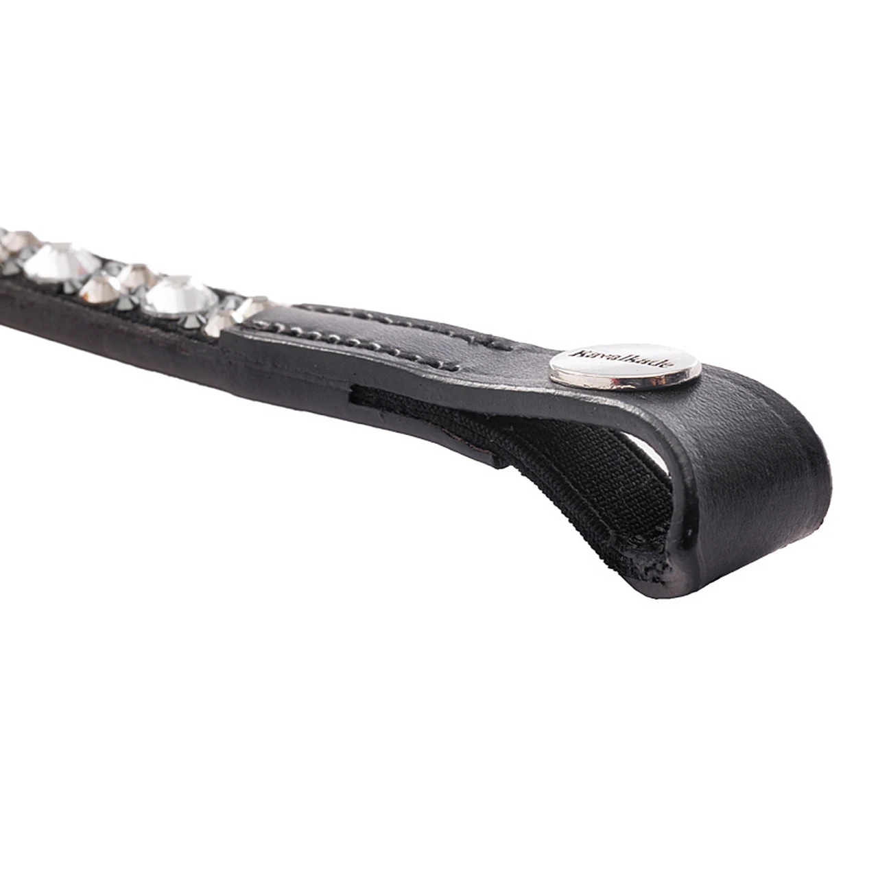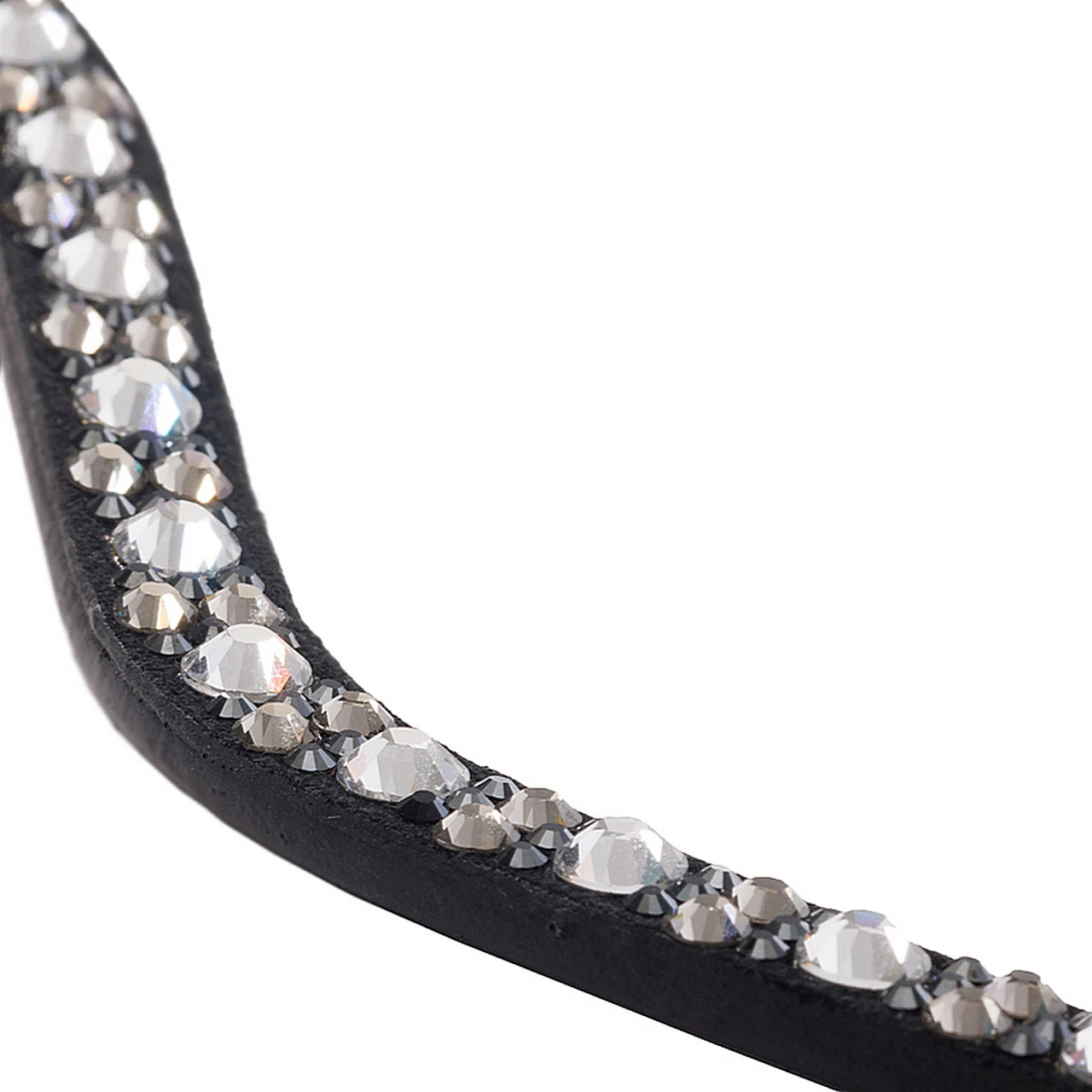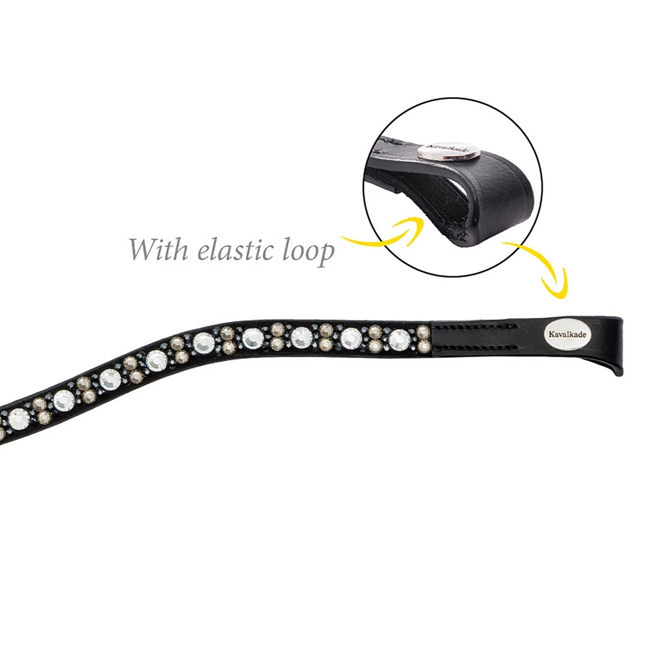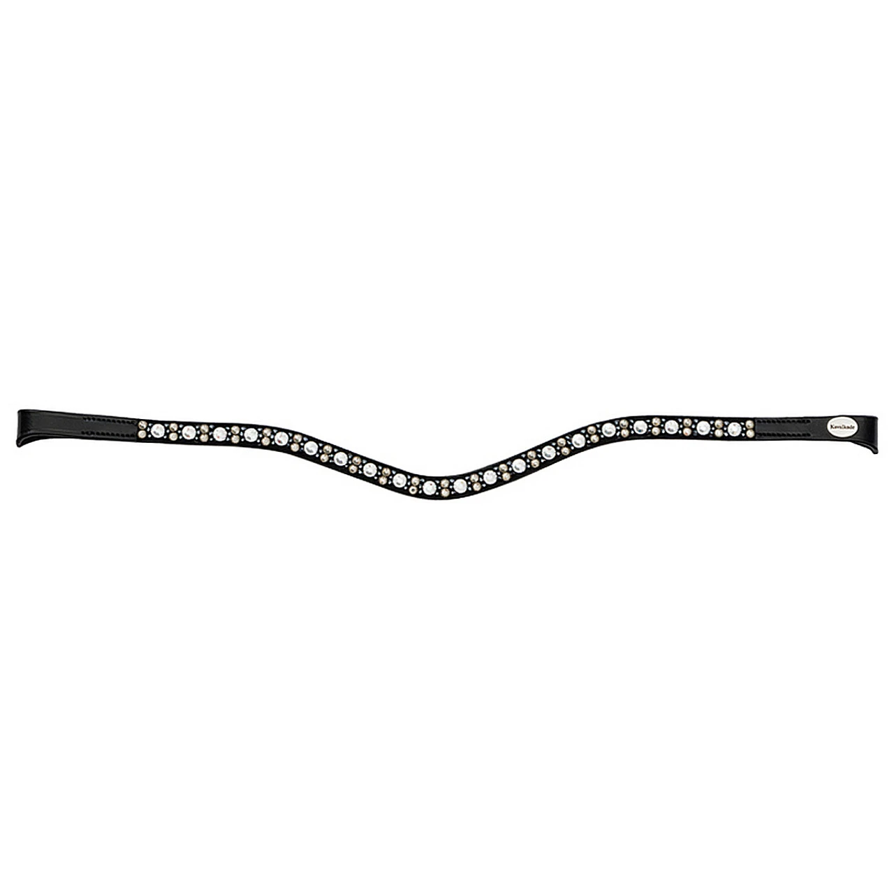 Kavalkade Blaze Browband has sparkling elegance in a narrow curved shape embellished with large and small black, grey and white rhinestones. The bling browband has a clever design with a discreet elastic loop on the sides that allow it to fit bridles with different widths.