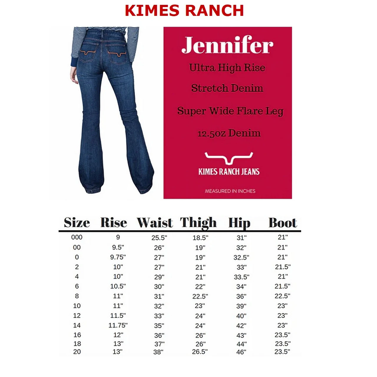 Kimes Ranch Jennifer High Rise Jeans have a trouser hem for extra style. The remarkable denim is 99% cotton with just a bit of spandex. These jeans will stretch out at the end of the day, so Kimes Ranch advises sizing down if that’s a concern for you. If you like that looser feel, you’ll love the Jennifer style! Made in the USA, Kimes Ranch Jennifer Jeans have great Western style with Kimes logo horns embroidery on the pockets. If you don’t see the size you want in stock, let us know so we can get that for you!