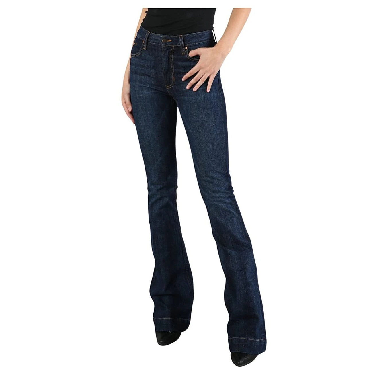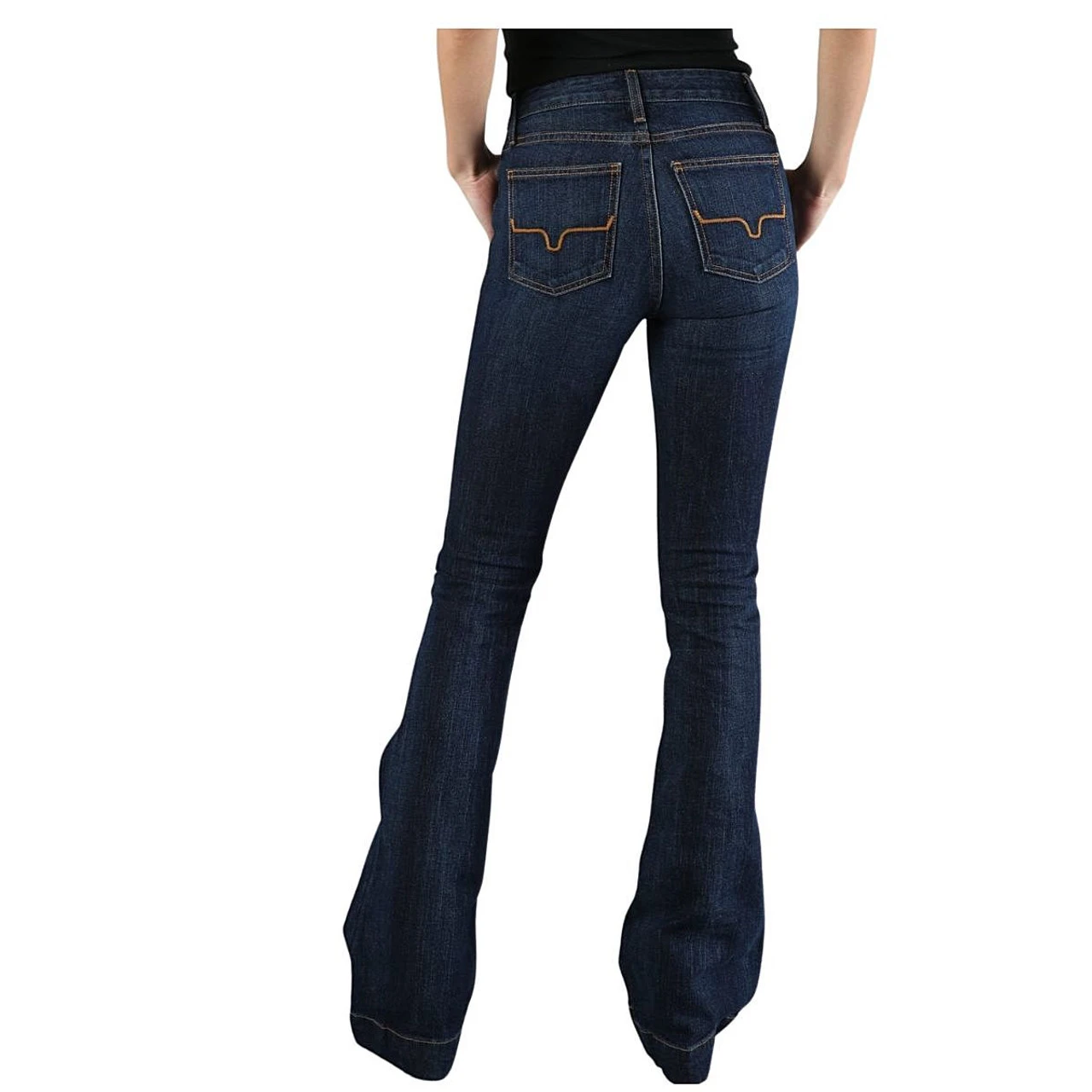 Kimes Ranch Jennifer Jeans are designed to flatter all shapes and sizes with a wide trouser leg, fitted knee, and ultra-high rise. The versatile Dark Wash with hand sanding and whisker details looks beautiful in the saddle or dressed up for any occasion.