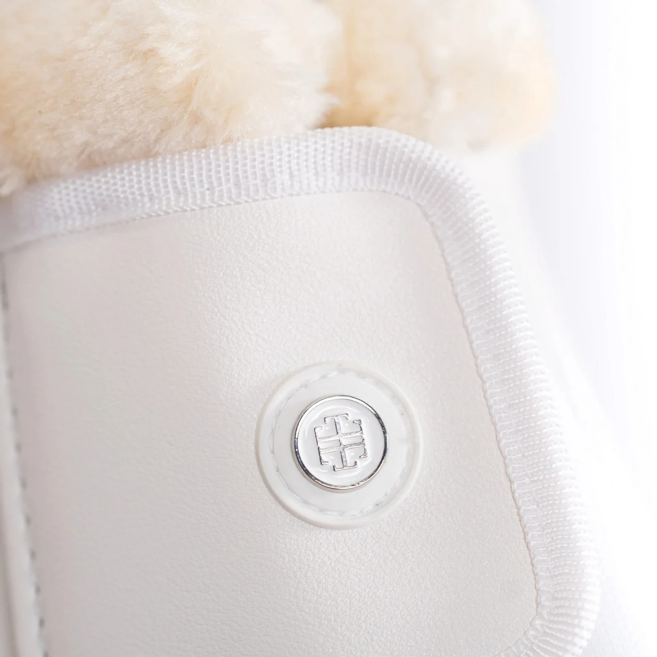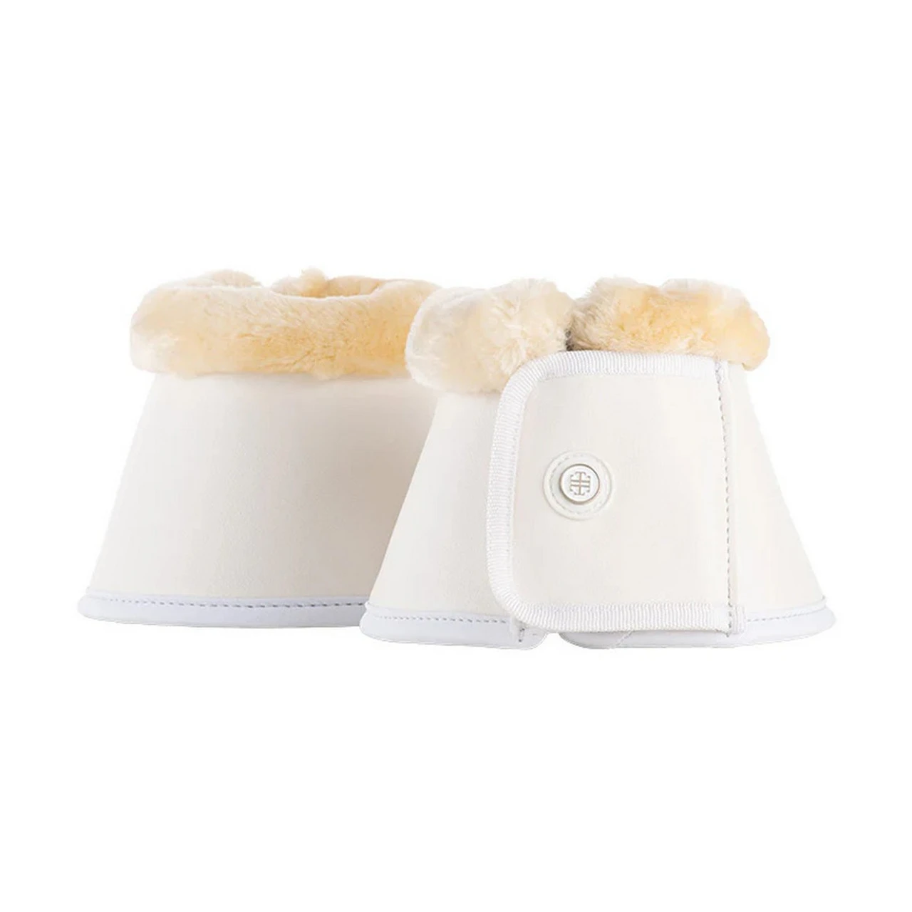 Lightweight yet durable LT Competition White Bell Boots for horses are trimmed with white plush faux sheepskin for a deluxe look and feel. The velcro inner tab is double stitched to keep the closure functioning properly ride after ride. Lara Tweedie Competition Luxe Bell Boots are sized Small, Medium, Large, and Extra Large. Consult the Size Chart image to get the right fit for your horse.