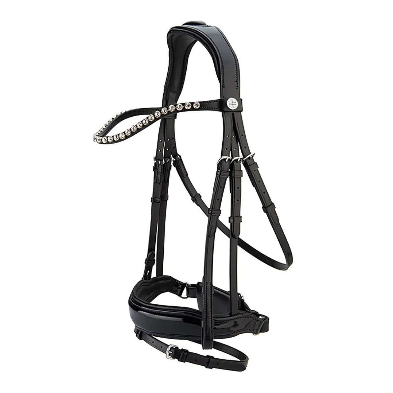 The Lara Tweedie Glam Snaffle Bridle with Flash has extra shine with the patent leather Glam Noseband and sparkling big crystal wave browband. The high fashion Lara Tweedie dressage competition bridle isn’t just pretty to look at; it is carefully engineered with premium materials like Italian leather and has an ergonomic design for a correct fit. Lara Tweedie is a dressage rider and equine veterinarian who knows properly designed and fitted tack is crucial to comfort and performance.