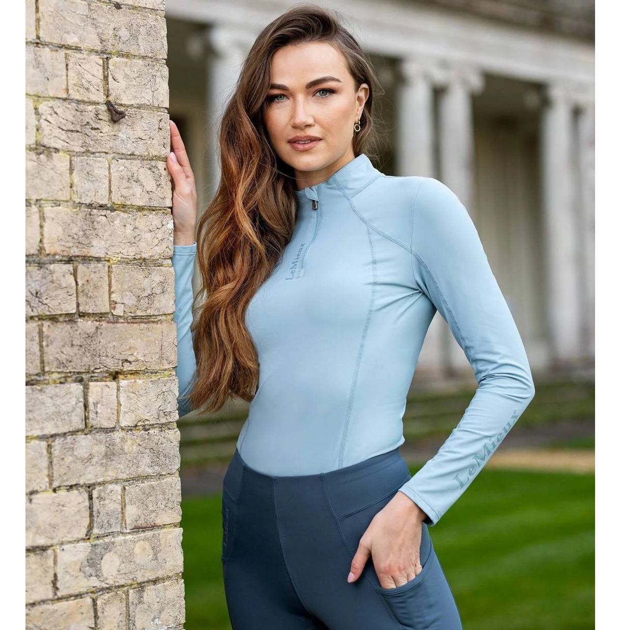 Women’s LeMieux Base Layer in Autumn/Winter colors Glacier and Petrol will keep you ready for whatever your plans may be. Riding, running, hiking, or any fitness activities can be done in comfort and style thanks to performance fabric and thoughtful design. The LeMieux Base Layer helps regulate body temperature so you stay cool and dry. The long sleeve tech shirt wicks sweat and is anti-microbial to keep odors from forming.
