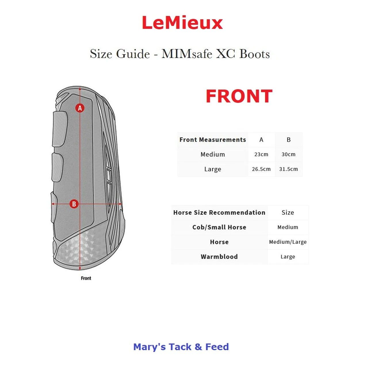 LeMieux MIMsafe Cross Country Front Boots have a streamlined design with ultra-strong TPU molded shell that incorporates the straps. The straps are non-elastic to prevent slipping and spinning on the leg and fasten with 3 hook and loop closures for an individual fit. An abrasion-resistant, integrated thermoplastic resin strike guard is fully bonded to the shell and lining, protecting the cannon bone and tendon while shock radiates away from impact. The adaptive foam interior absorbs shock and is treated to resist water uptake. There are 9 air vents and a ventilated friction-free binding to release heat for cooler legs. LeMieux MIMsafe Cross Country Front Boots are beautifully designed for safety and horse protection.