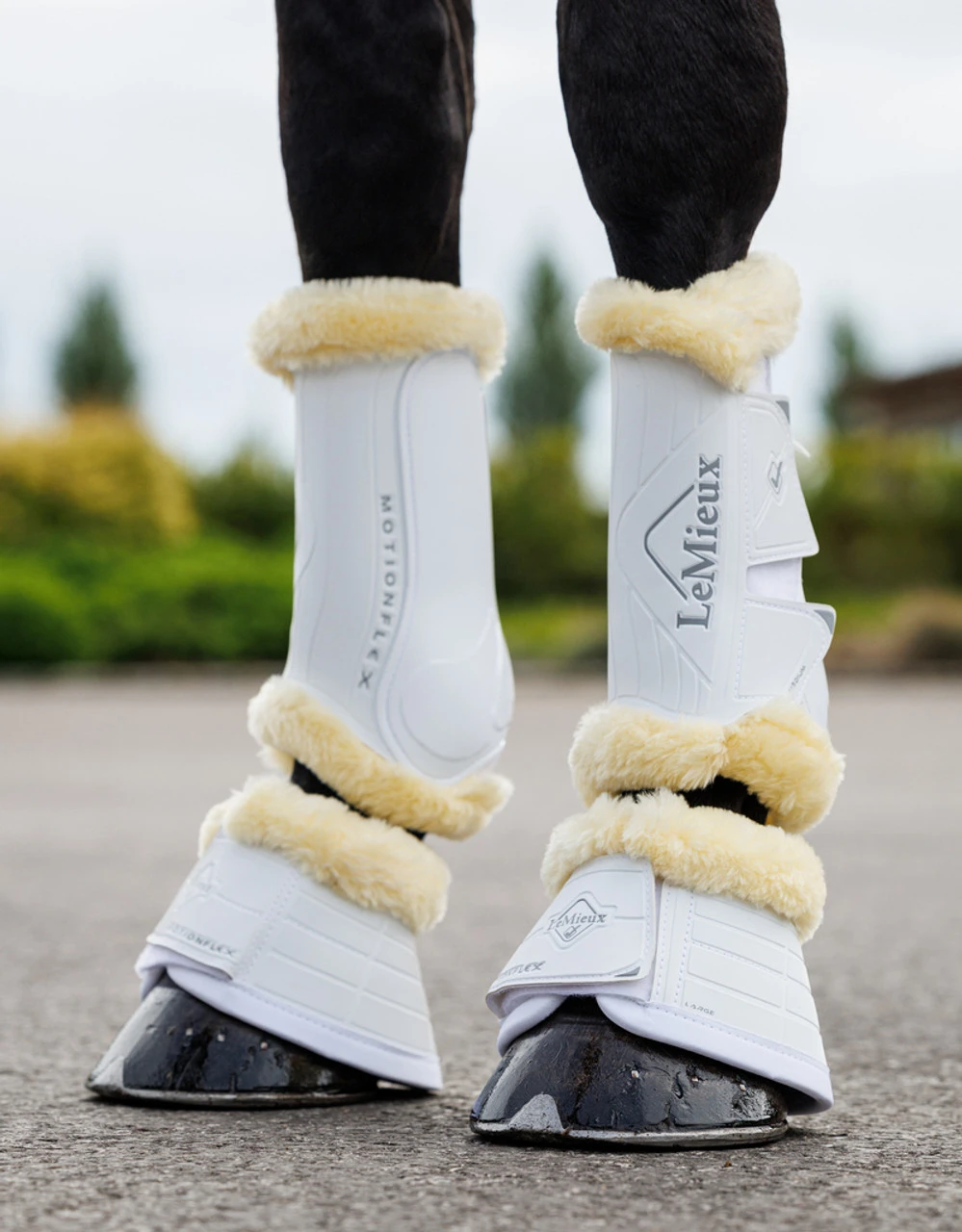 Motionflex Overreach Boots from LeMieux are carefully designed to prevent the rubbing and pressure of more rigid bell boots. Radial compression lines run around the boot to create flexion under pressure as the fetlock lowers. Breathable Simuwool fleece edging traps dust and debris and adds a luxurious look. LeMieux Motionflex Fur Edge Overreach Boots are the perfect match to the LeMieux Motionflex Fur Edge Dressage Boots.