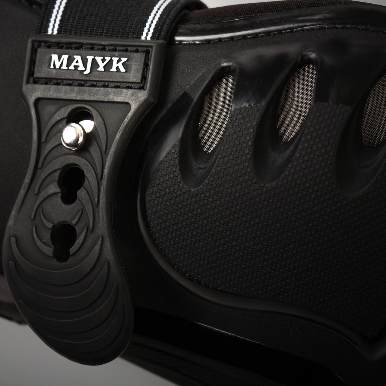The Boyd Martin Stadium Hind Jump Boot is the perfect competition boot with innovative materials and a design focused on safety and comfort. The BASF TPU flexible outer shell is vented to cool your horse’s legs and provides dual-density strike guard protection. The inner strike guard has ARTi-LAGE, a proprietary dynamic material found only in Majyk Equipe boots.