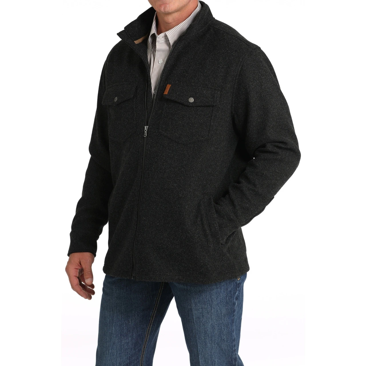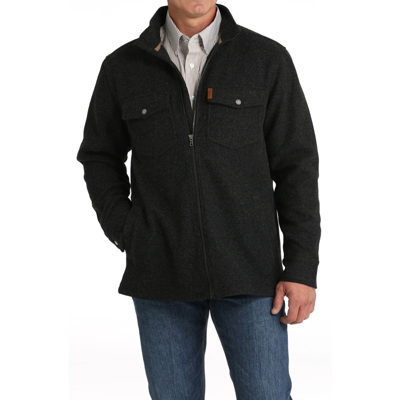 Black Brushed Knit Shirt Jacket from Cinch has a full length zipper, welted pockets for warming up cold hands, and snap cuffs. There are convenient roomy snap flap pockets at the chest with a leather Cinch logo tag. Cinch Brushed Knit Shirt Jacket is a great look for both ranch and town in a heavier weight for cold weather.