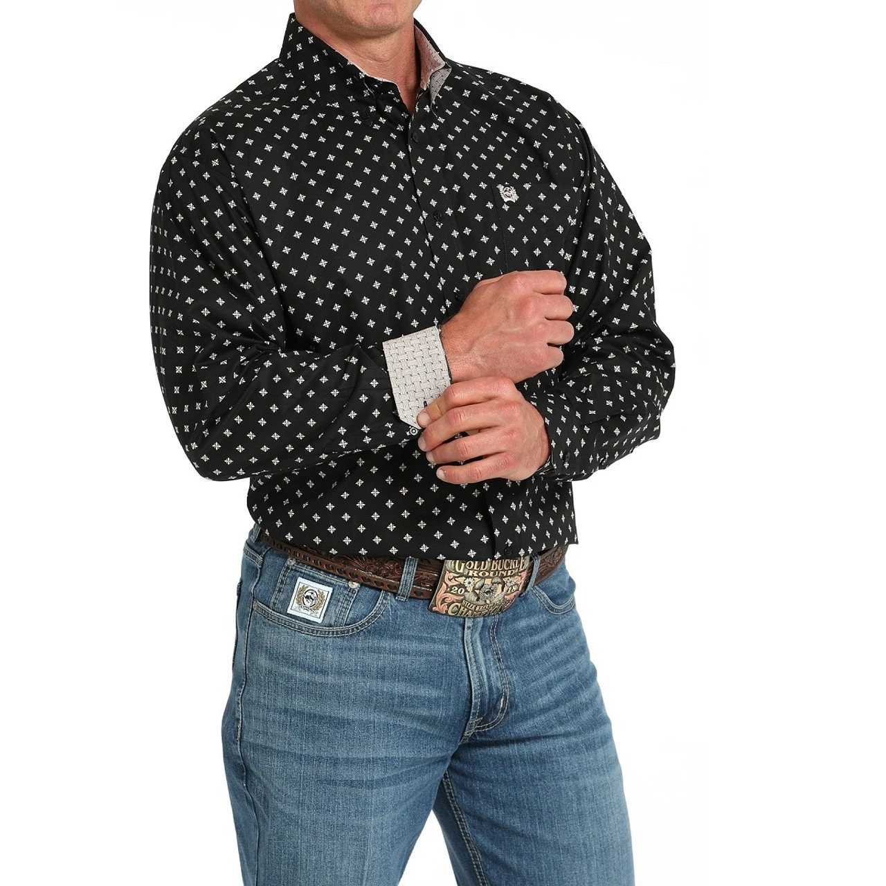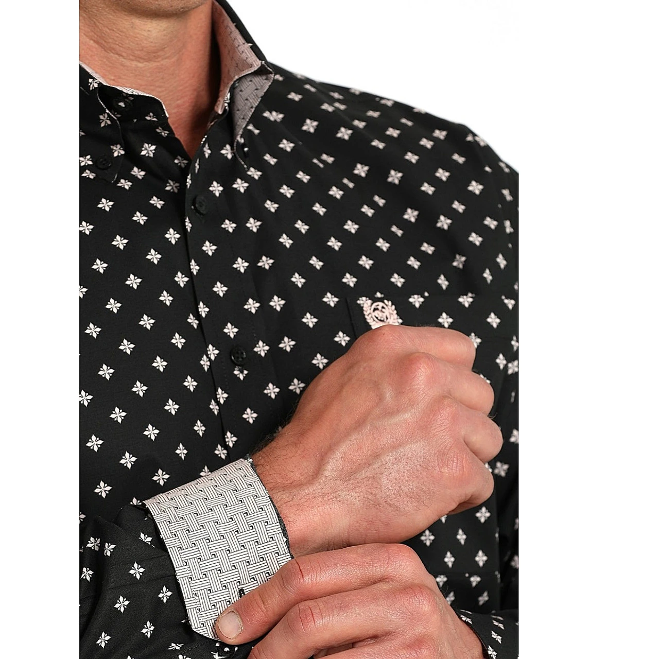 Men’s Cinch Classic Fit Stretch Long Sleeve Shirt is a handsome Western shirt with value-down collar, roomy fit, and sophisticated print. The traditional styling plus comfortable feel makes this a great choice for Western showing and competition. Cinch men’s long sleeve shirt is black with a muted pink small tile print with timeless style.