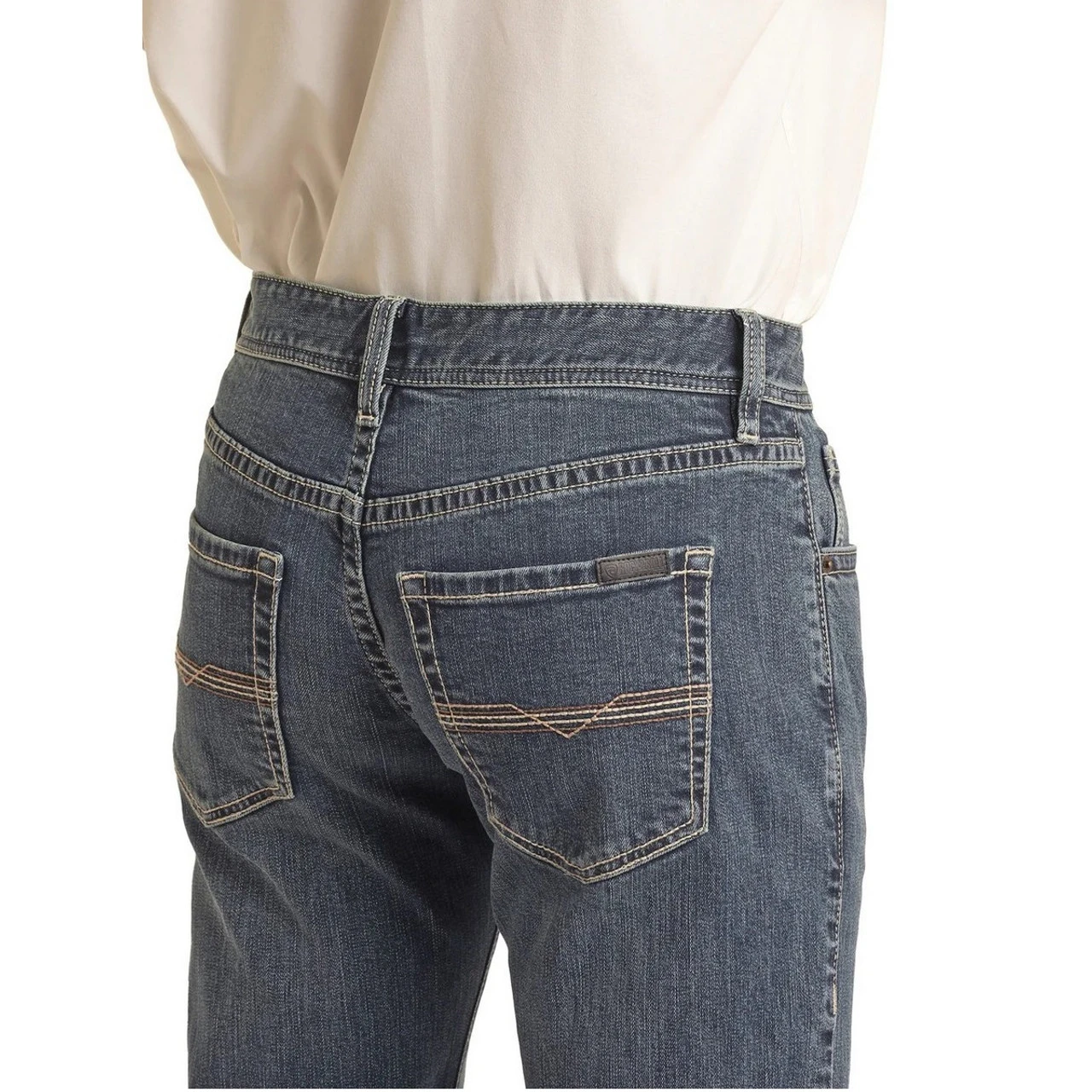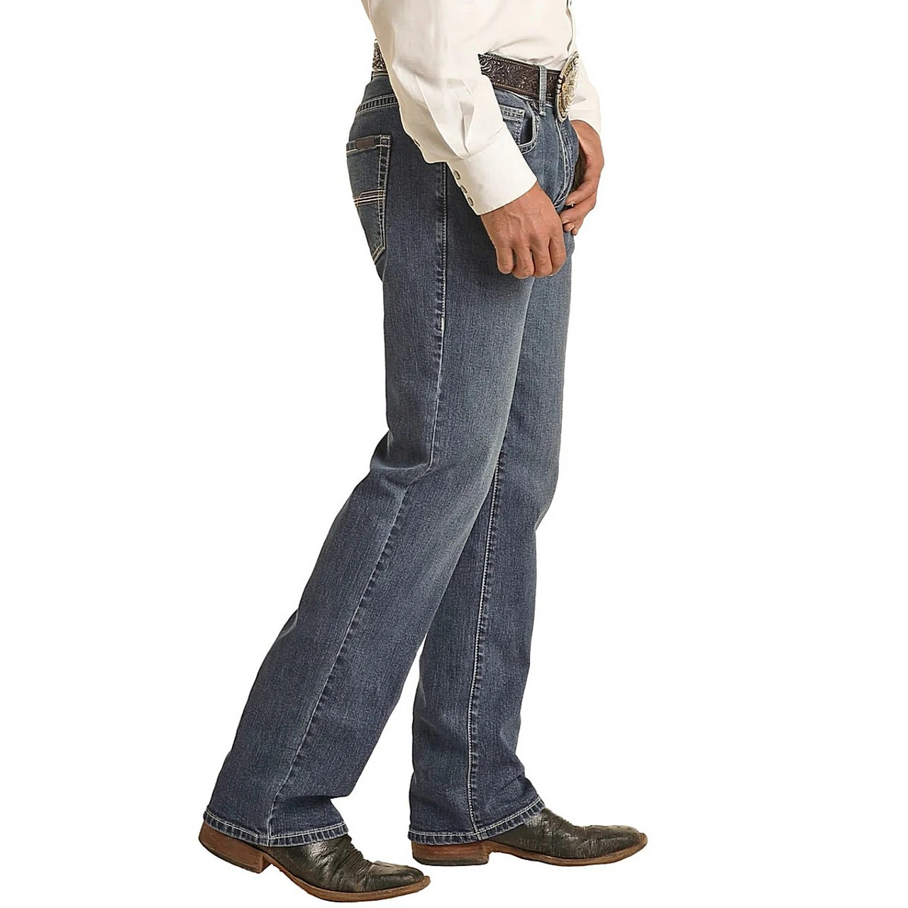 Men’s Rock & Roll Denim Pistol Stackable Bootcut Jeans have a zip fly with value closure and classic design with 2-tone embroidered back pockets. The stackable bootcut leg works easily with cowboy boots and hiking boot styles. Cowboy jeans with a medium wash are versatile for wearing with value down shirts as well as casual tees. Vintage ’46 Regular Fit Pistol Stackable Bootcut Jeans from Rock & Roll Denim are perfect for riding, ranch work, and the Western lifestyle.