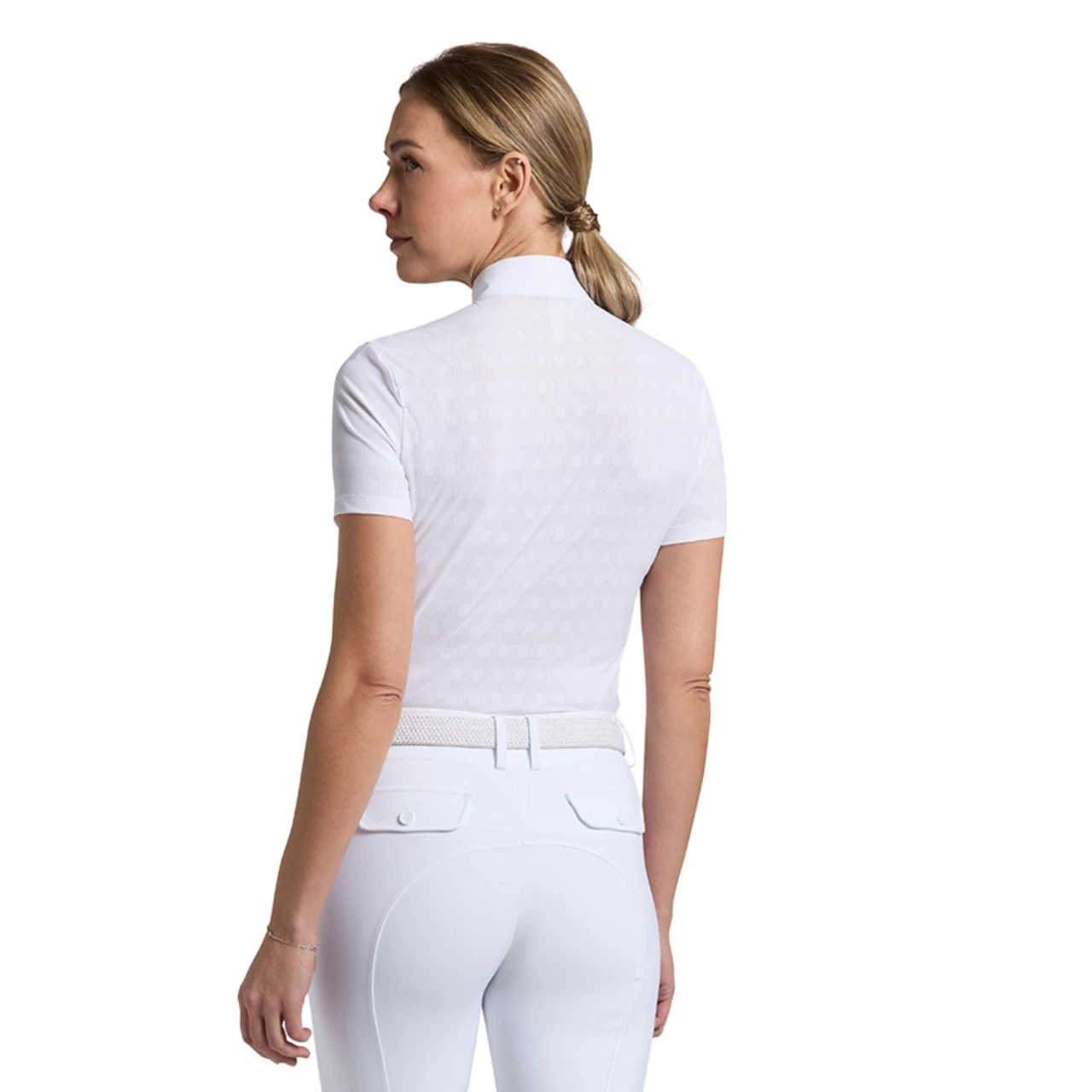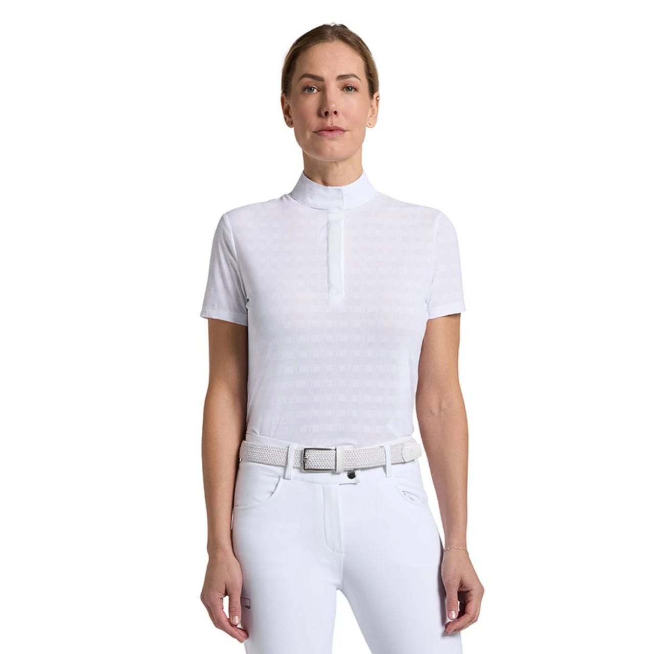 Women’s Rider’s Gene Jacquard Jersey Show Shirt has a contemporary textural pattern in the RG rectangle pattern. A high collar with a zip closure is accented with a sophisticated RG logo. The Rider’s Gene Jacquard Jersey Short Sleeve Show Shirt in White is perfect for riders needing a functional yet fashionable hot weather show top.