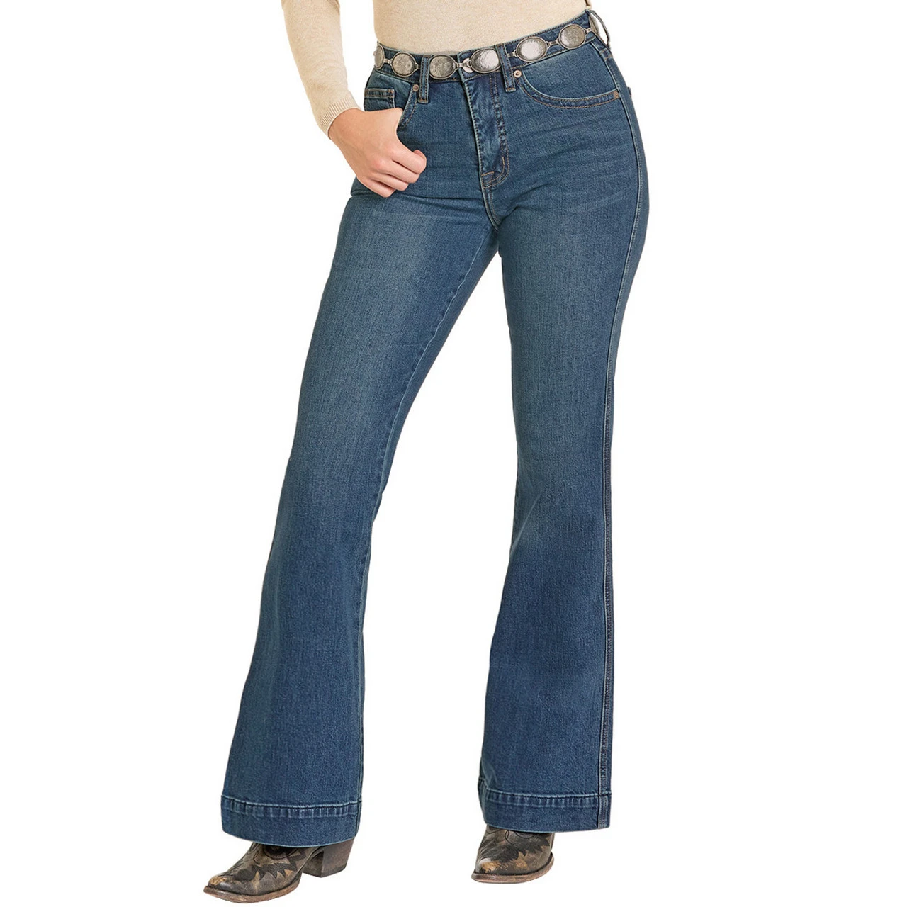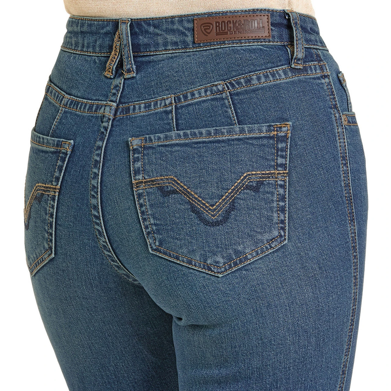 Rock & Roll Denim Signature High Rise Trouser Jeans have the R&RD Flawless Fit plus Advanced Slimming Stretch Technology. Women’s versatile Western jeans in Medium Wash have classic elements like embroidered pockets with updated seam detail.