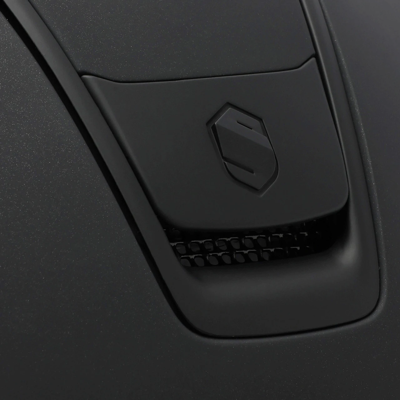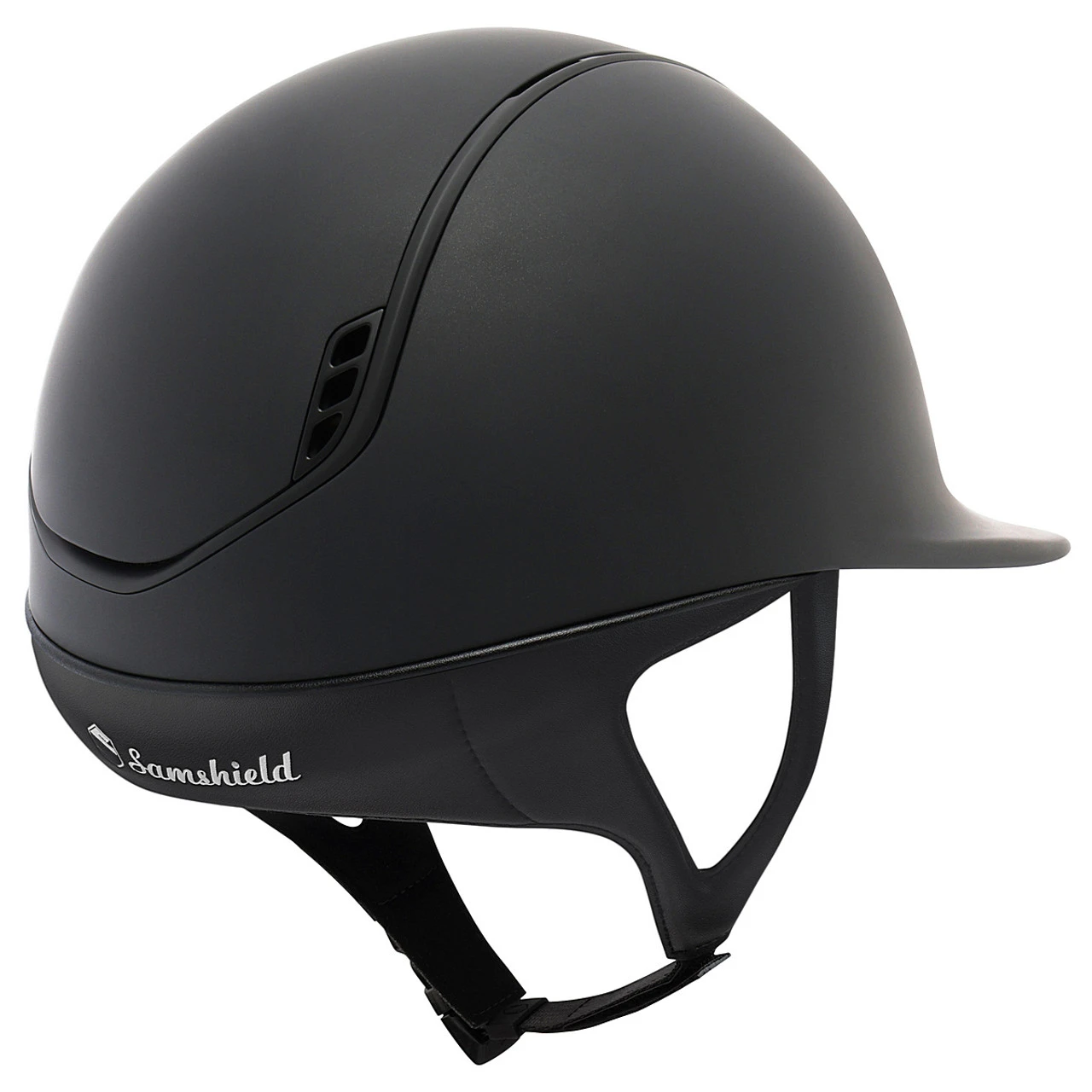 Samshield 2.0 Dark Line Shadowmatt Helmet with updated head protection and ventilation has a special monochromatic matte black finish on the shell, trim, and blazon. The polycarbonate outer shell with integral visor has an anti-scratch matte finish for long-lasting good looks. The sturdy, comfortable leather harness has a secure snap closure with velcro tab to adjust. The Dark Line Shadowmatt 2.0 riding helmet has a sophisticated look and very comfortable feel.