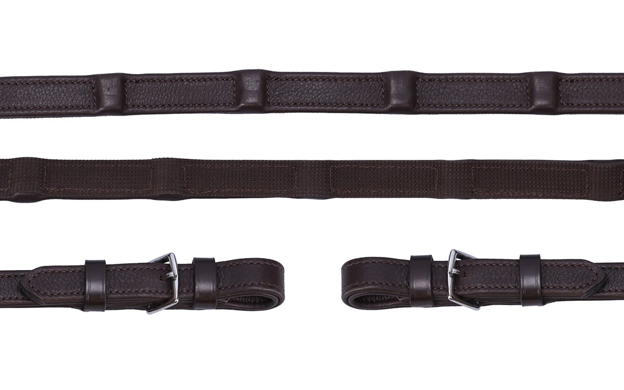 Schockemöhle Durasoft Wide Grip Reins are a hard-to-find 18mm width (just over 11/16″), wider than the more common 16mm (5/8″) reins. These reins are very durable with a webbed nylon core for greater resistance to tears and stretching. The leather reins have a rubber grip underneath and integrated hand stops.