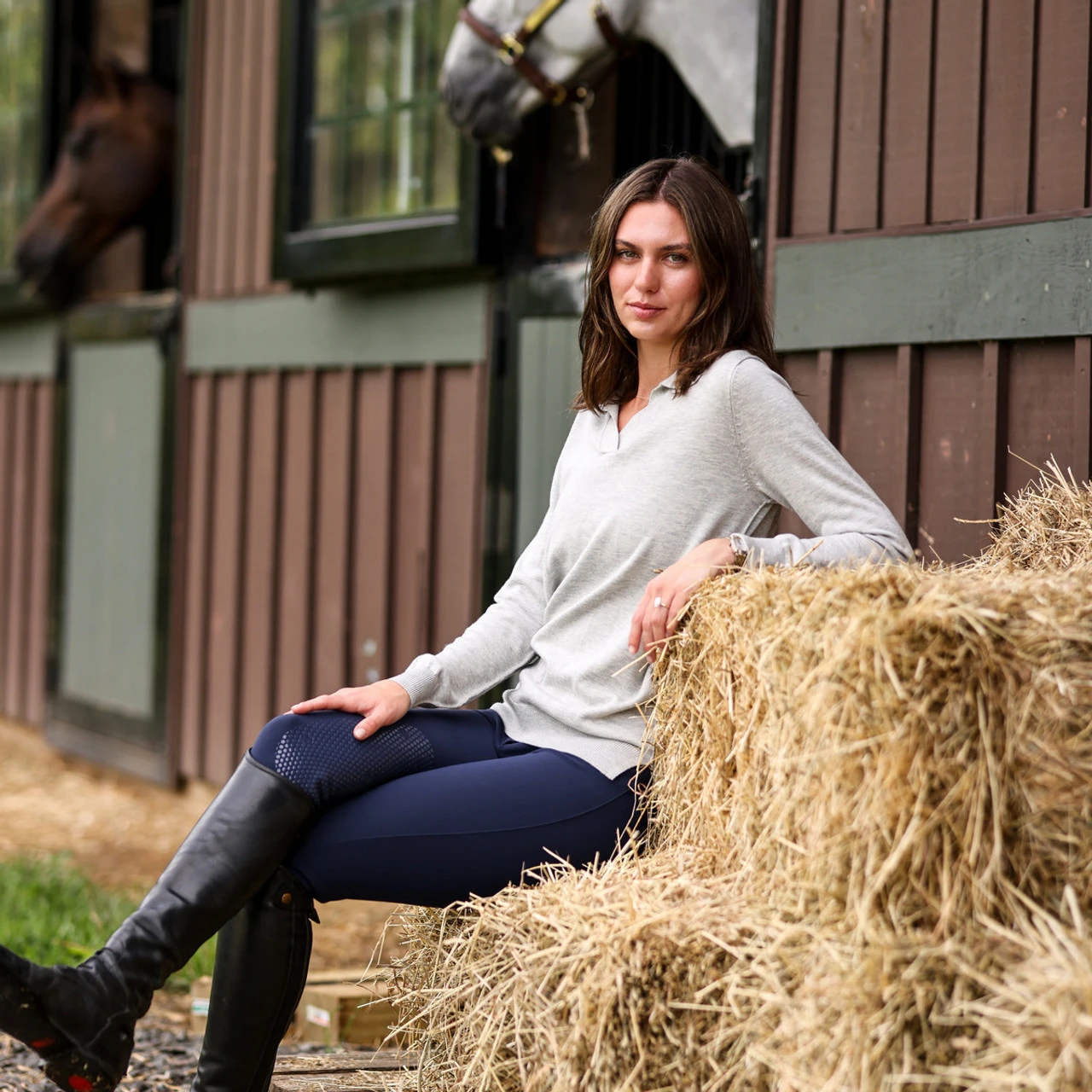 TKEQ Polo Sweater is made with a breathable acrylic/cotton blend knit with ribbed cuffs and hem. Wear it on its own, layer with a vest, or add a distinctive accessory, like a scarf, for bonus style points. This is an easy one to pair with your breeches, tights, and jeans. Women’s lightweight equestrian sweater is designed with a somewhat relaxed fit and plenty of comfortable stretch for riding and recreation.