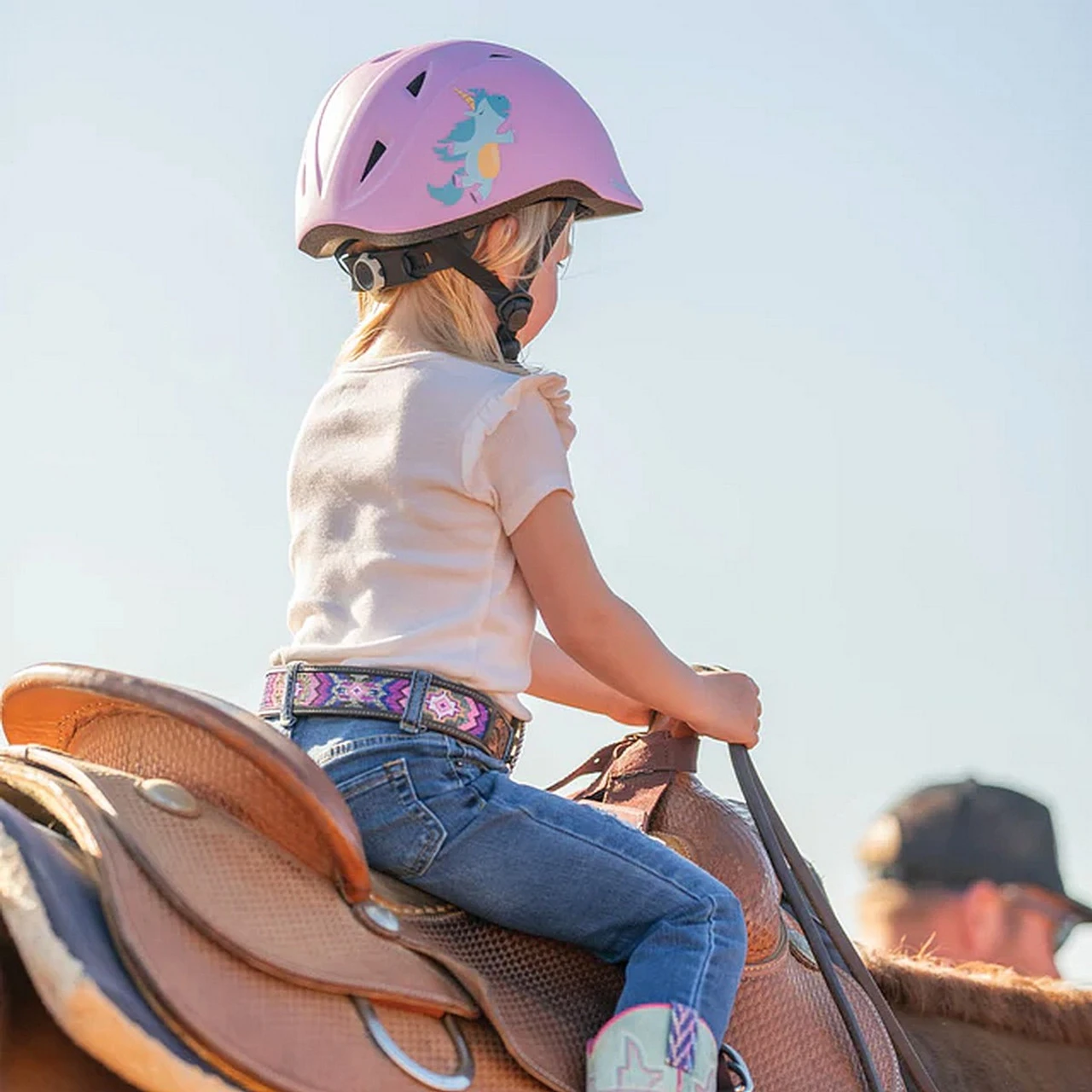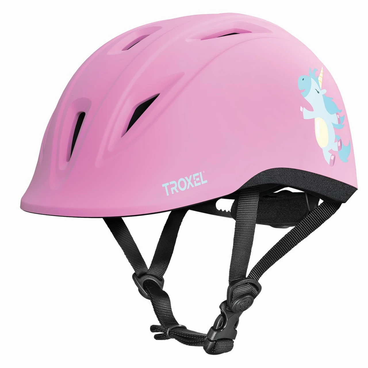The Troxel Youngster Helmet is an ASTM/SEI certified equestrian helmet for small children. It features a DialFit system and washable headliner with FlipFold fit adjustment to create the best fit and feel. There are multiple vents for cooling airflow to keep the fun going on warm days. The Youngster Helmet has a Matte Duratec finish with cool graphics for the littles. The blue helmet has a dinosaur and the pink helmet has a unicorn. The Troxel Youngster Helmet is an excellent choice for safety, comfort, and style!