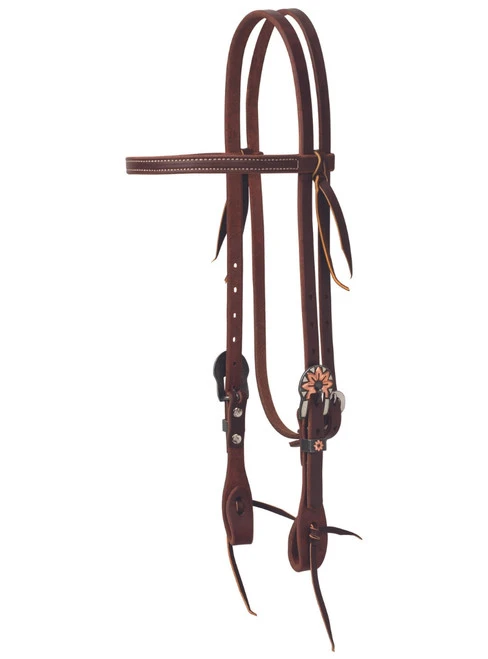 Weaver Copper Flower Brow Headstall is hand crafted with weighted premium canyon rose harness leather. It is dipped in oil, dressed with saddle butter, and hand rubbed to achieve a beautiful look and feel. The straight browband has latigo tie accents. Copper Flower Browband Weaver Working Tack Headstall is pretty yet rugged enough for daily use.