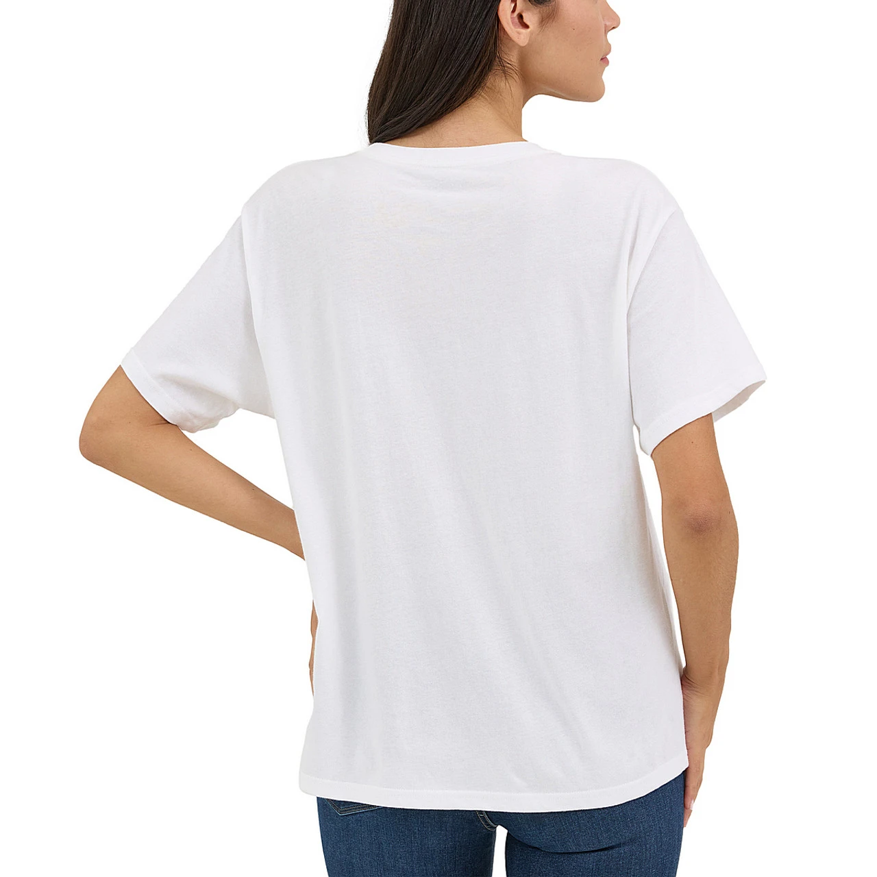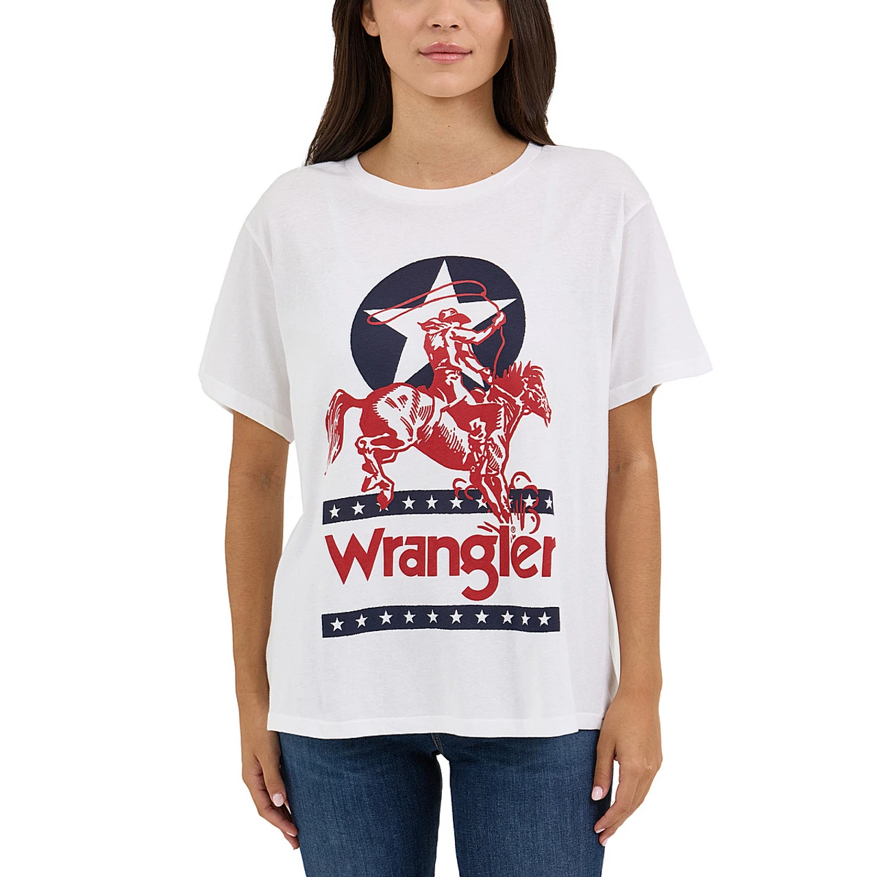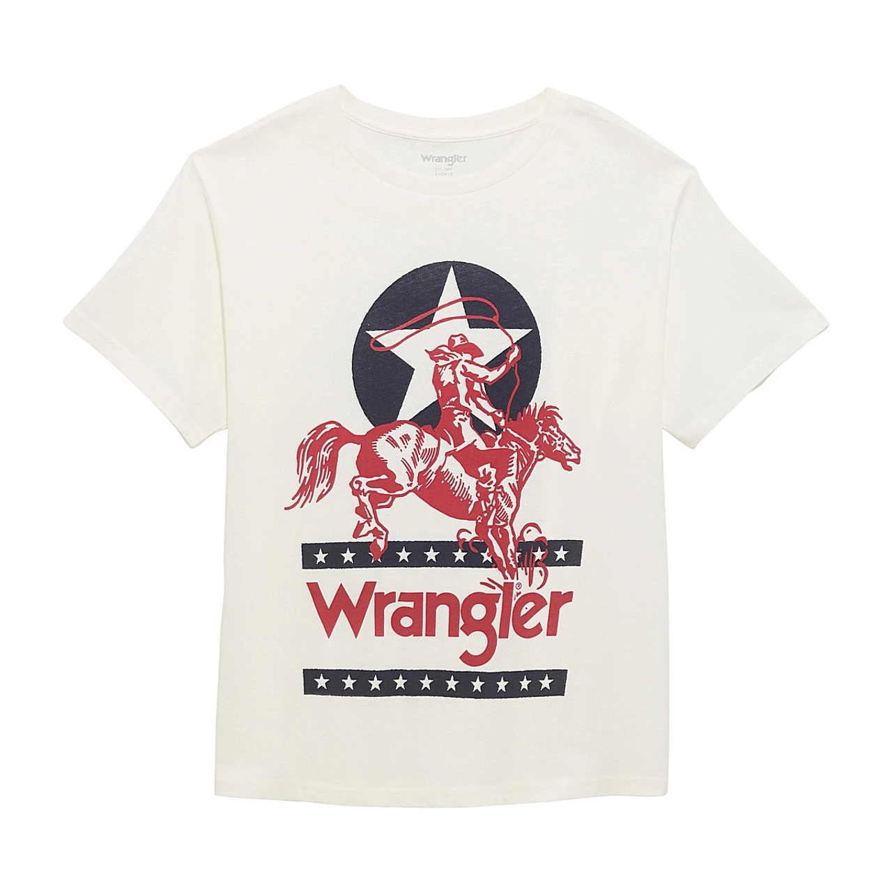 Wrangler Cowgirl Cotton T-Shirt has a retro cowgirl and stars bold graphic in dark red and blue on white. It has short sleeves and a rib knit crew neck with printed tag inside for comfort. Easy-going with authentic Wrangler heritage, the Wrangler Cowgirl Cotton Tee will be a favorite thanks to the classic colors, breathable comfort, and soft feel. The budget-friendly price makes it even better!