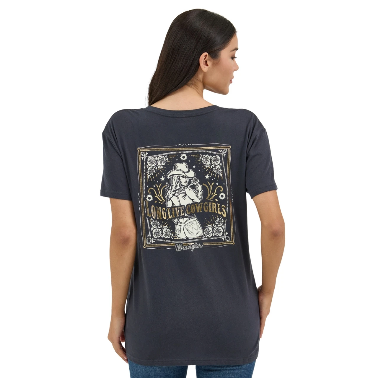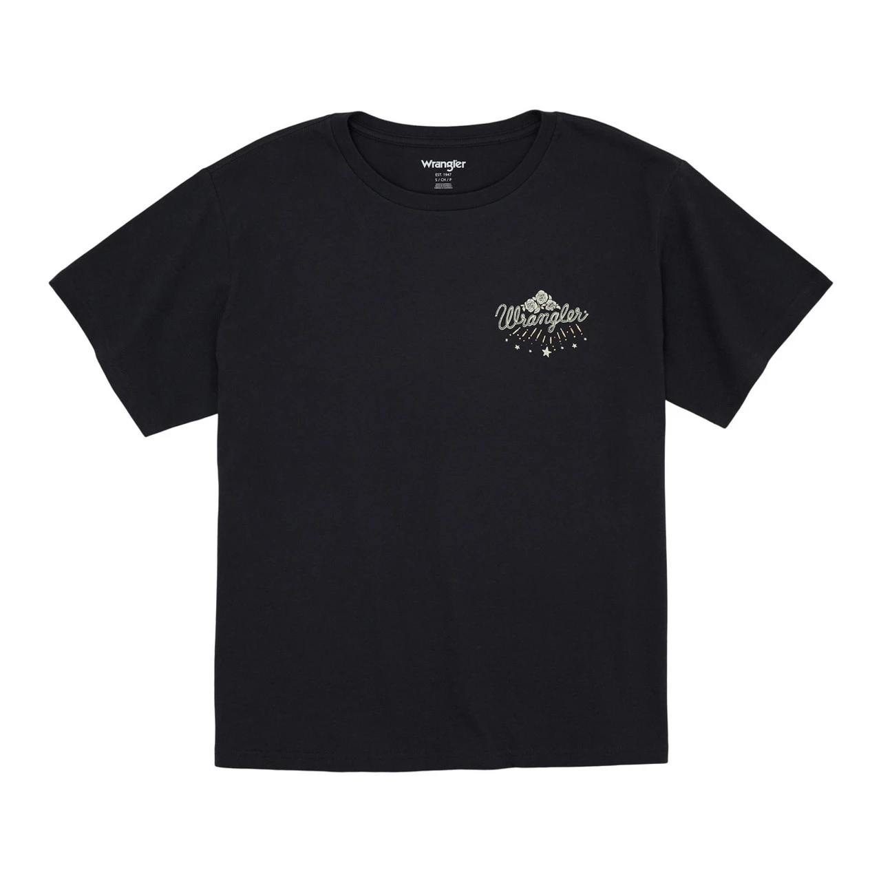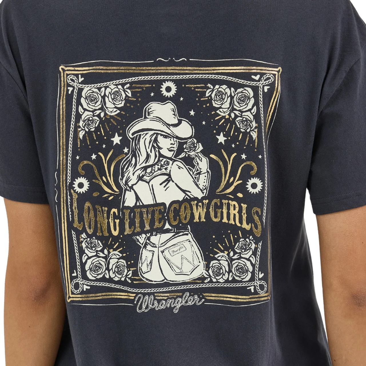 Wrangler Long Live Cowgirls Tee has Boyfriend Fit with crew neck and short sleeves. There’s a smaller graphic at the chest of a Wrangler rope logo with roses and star and gold foil accents. The slightly faded black color, vintage graphic, and dashes of shimmering gold give the Long Live Cowgirls Tee a little edge for modern style. The cotton T-shirt from Wrangler is extra soft and stretchy so it’s perfect for riding, relaxing, and having some fun.